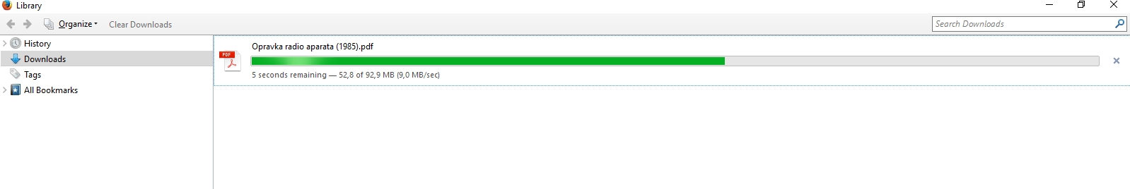 Traka za prikaz skidanja je na oko 60% i pokazuje da je do kraja ostalo 5 sekundi. Takođe i prikazue momentalnu brzinu downloada.