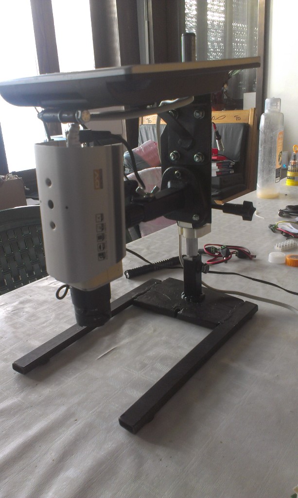 Ovo je sprava koja je potrebna kod rada sa sitnim komponentama i onom kome je čak i lupa postala problem (sve to ide sa godinama kao što je slučaj kod mene), a dobro dođe i mlađima da ne naprežu oči.Poenta svega je položaj monitora koji je mnogo bolji za posmatranje i rad na ploči (kao kad se radi sa lupom) od standardnih mikroskopa koji su do tri puta skuplji.Iskorišćena je starija kolor kamera za video nadzor, jedan osmoinčni TV monitor sa video ulazom, nosač kamere, malo lima i cevi i jedna led baterijska lampa.Ovo je već ranije odrađeno i samo je uvod za drugu spravu koja je u pripremi (menjam položaj sočiva na kameri ) pa će biti više slika u rasutom stanju za sklapanje.Sve ovo izađe ispod 100 evra (kamera 10-tak, monitor za video nadzor do 50)
