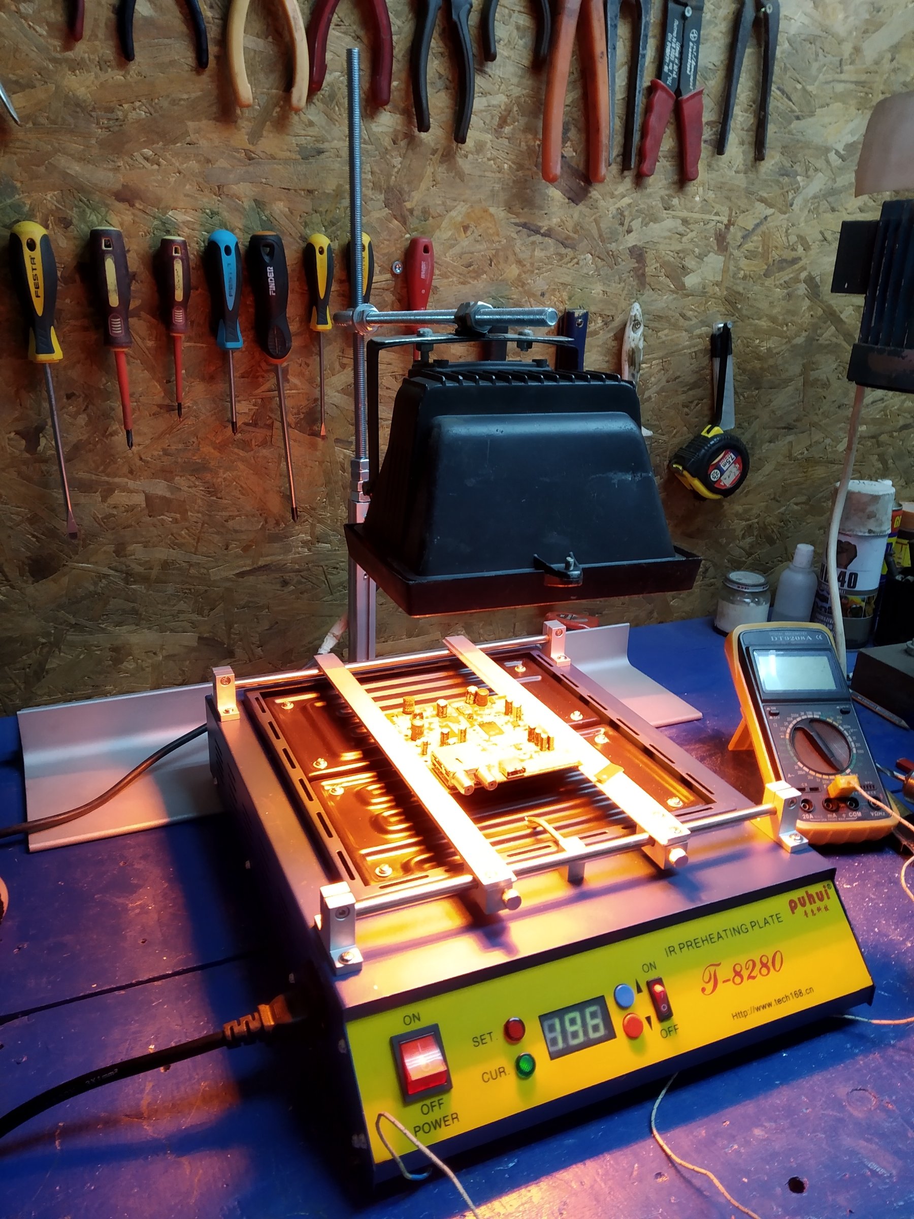 Skarabudžio sam konstrukciju i probao sa predgrejacem.Kad dogura predgrejac plocu do 160 stepeni odozgo upalim lampu i dobijem za desetak minuta dovoljnu temperaturu da mogu da skidam i vraćam pincetom delove bez problema.Kolko je to ne bih znao jer nisam zalepio sondu kapton trakom pa mi je odpala na 180 stepeni kad je počeo da se topi kalaj.Predpostavljam da sam lepo radio negde oko 200.