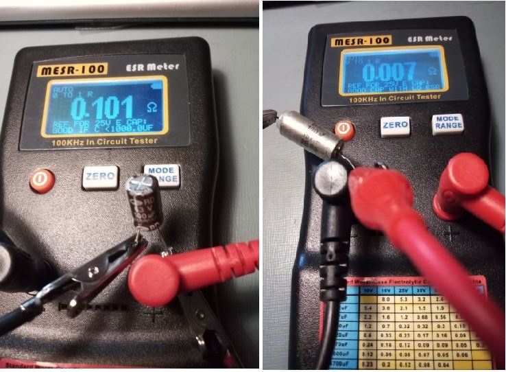U svrhu mjerenja ESR-a na ploči (in circuit) treba koristiti kvalitetne pipalice sa silikonskim kablovima što debljeg profila žice i što manjeg otpora (do negdje 0.08 Ω max.) i tada sve funkcionira.