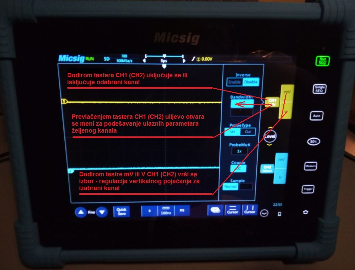 Da bi uključili meni za podešavanje mjernog uzlaz potrebno je prstom (ili mišem) prevući ulijevo ikonicu CH1 ili CH2 u zavisnosti koji ulaz želimo da podesimo.