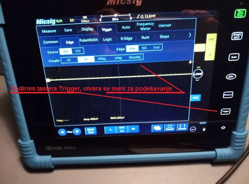 Da bi slika bila mirna na ekranu potrebno je pravilno izabrati signal za okidanje - sinhronizaciju. Dodirom tastera Trigger otvara se dodatni meni u kojem imate veliki izbor triger signala.