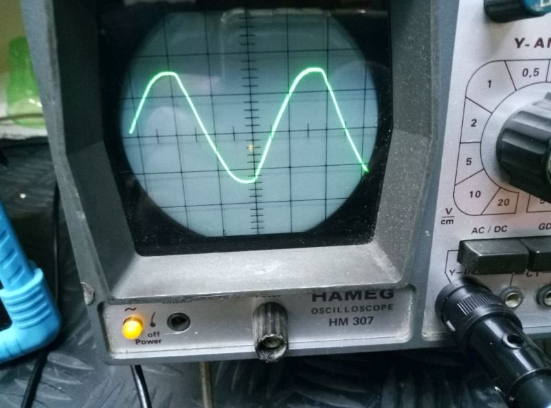Prvo šta sam želeo da vidim je kako digitalni osciloskop prikazuje sinusoidu. Prikačio sam sondu na sekundar mr. transformatora 12V i na ekranu se pojavila sinusoida. U startu nisam bio zadovoljan slikom zbog malog zakrivljenja u gornjoj poluperiodi. Da bih bio siguran da li je greška do uređaja ili ne, na isti trafo sam prikačio i analogni osciloskop. Ovo zakrivljenje se vidjelo i kod analognog instrumenta. Znači da nešto "prlja" mrežu i da impulsi nisu onakvi kakvi bi trebali da budu. U principu, ovo me ne interesuje. Bitno je da je digitalni osciloskop pravilno prikazao impulse.