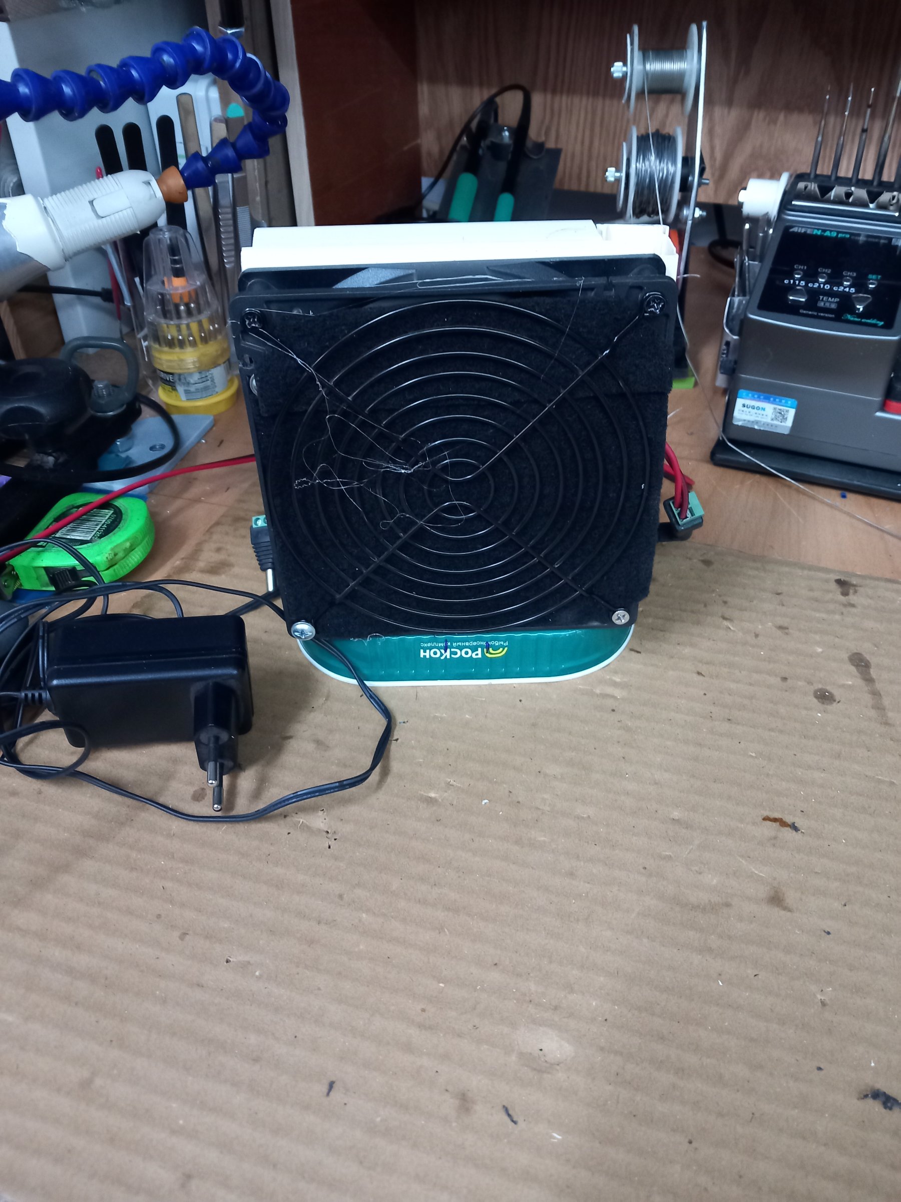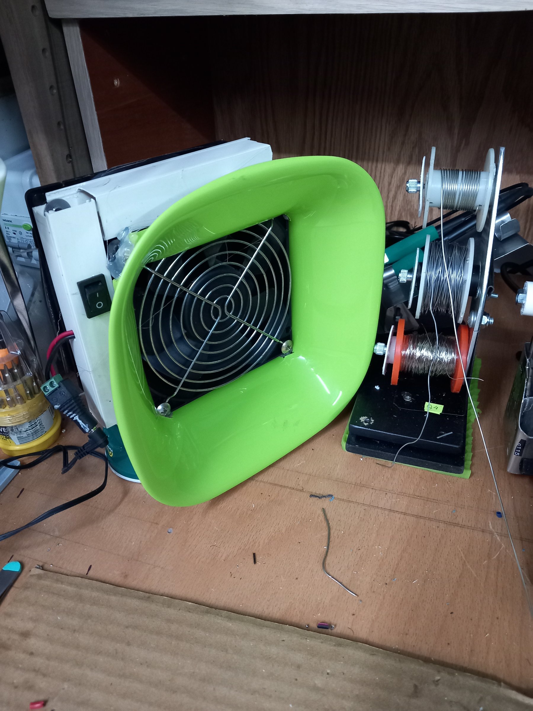 prelomio te sam odradio drugi aspirator po uzoru na već poznato rešenje.Nije mi trebalo puno vremena i u tu namenu sam iskoristio ventilator od aparata za zavarivanje 24V 0,35A veće brzine 12x12cm (ta veličina je bitna, manje ne više da), karbonski filter za kuhinjske nape )može i običan ali je ovaj bolji, njega sam pre par godina naručio iz Kine) kao i jedan ventilator u kvaru 14x14cm (takav beše neispravan) kao i jedna konzerva ribe(prethodno je pojedena) za malo postolje.Ventilatori su spojeni a razlika od 2cm je popunjena kanalicom 20x20 te je na jednom delu postavljen prekidač.Napaja se iz adaptera 24V 0,8A.I to dobro radi, mobilan je, malo je bučniji zbog veće brzine ali ne smeta, uvek je tu muzika koja pravi društvo.A kako je zadnji dan ove godine svima koji ovo čitaju želim dobrog zdravlja. Ovaj sam ostavio jer ne smeta