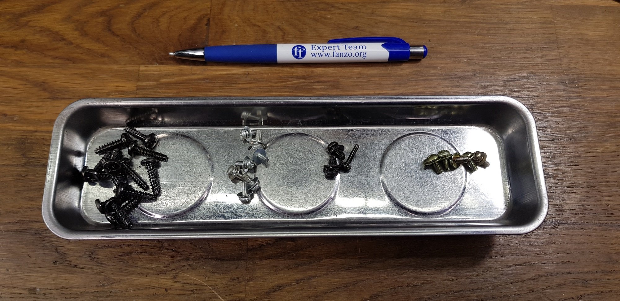 Prilikom rasklapanja TV-a šrafiće selektujemo,po fazama rasklapanja u odvojene posude.Ali desi se ponekad da posuda ispadne.Rešenje su potrošene mekane plastične kutije od štapića.Idu jedna u drugu i ostaje oko 3cm prostora.Dovoljno za razne šrafiće i manje plastike.Dobijeni toranj zauzima malo mesta,može da ispadne,da se skloni sa stola bez gubitka redosleda sklapanja.I takođe bitno,nema viška srafića ili plastika kad se sklopi TV jer je prvi nivo pri sklapanju gornji,pa svaki sledeći nivo prati fazu sklapanja.