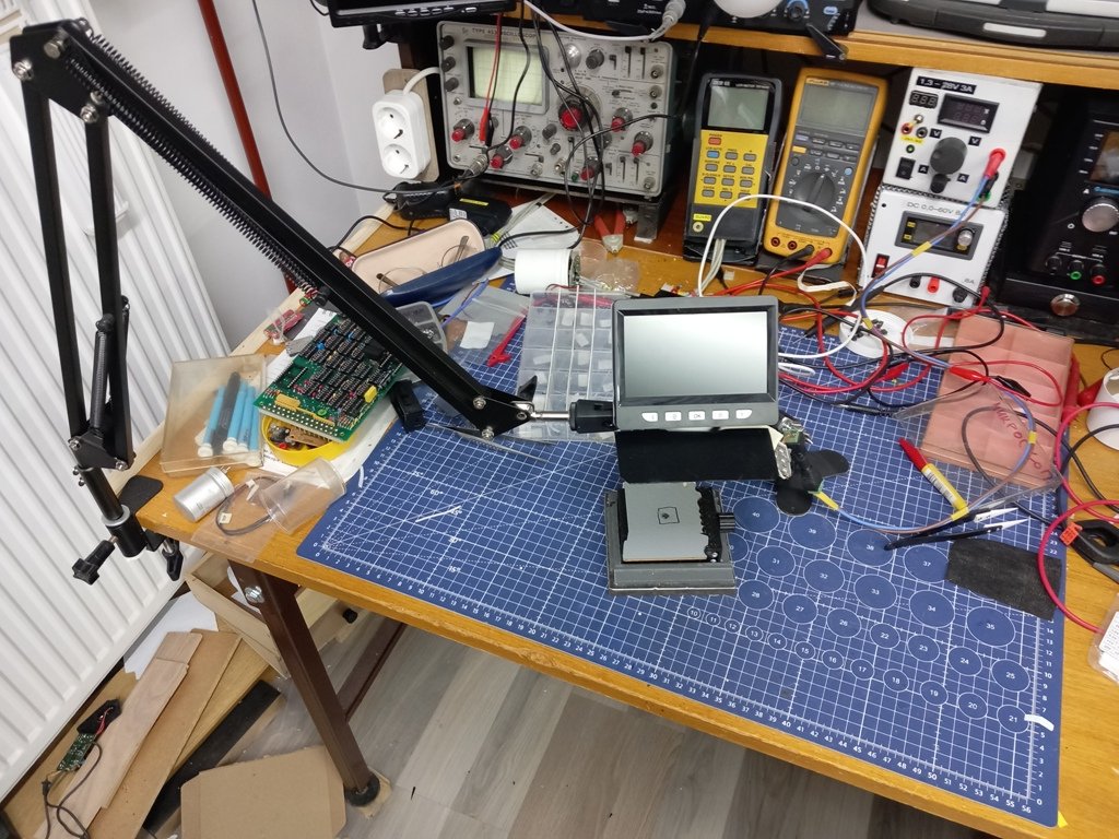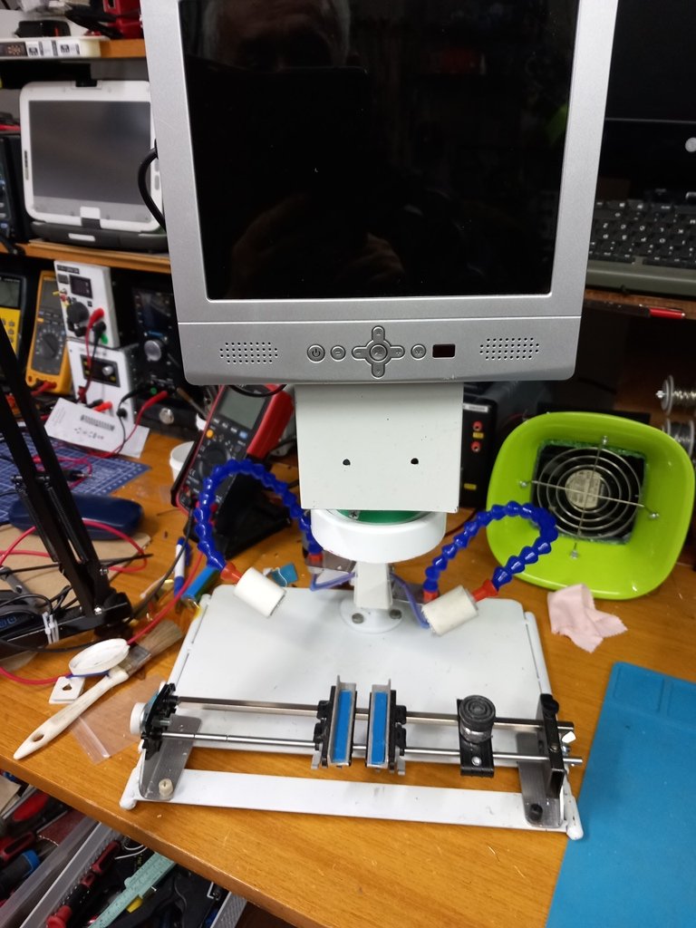 Pa posle nekih 8 godina kako sam krenuo sa izradom mikroskopa gde sam se opredelio da kamere za video nadzor (tada se dosta radilo videonadzora) budu okosnica mikroskopa. Za svo vreme eksperimentisanja dosta se promenulo kamera i sočiva, monitor je od početka isti.Rezultati su bili zadovoljavajući sve do kupovine sadašnje kamere i sočiva gde se pokazalo da to zaista dobro radi.Kako je sin krenuo sa izgradnjom železnice intenzivno ga koristi oko modula za vagone koji su malog gabarita gde se za povezivanje koriste veoma tanke žice za povezivanje (nabavlja ih iz Engleske jer nema ni kod Kineza)pa sam zbog toga krenuo da osposobim digitalca pa sam nabavio 7 inčni monitor pa su u prilogu slike jednostavnog nosača od običnog lima koji odgovara za Aleksino postolje.
