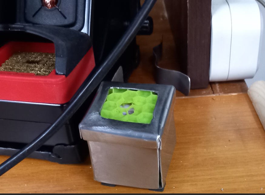 Nastavak za silikonski čistač vrhova.Ovo je konačno rešenje silikonskog čistača vrhova a sastoji se iz četvrtaste posude sa otvorenim poklopcem dimenzija 40x40x40mm rađena od 1mm nerđajuđeg lima, silikonska podloga bilo koja (može i 2 ravne kuhinjske silikonske varjače ) i 4 silikonske četke.Prvi i zadnji sloj (sa malim prorezom) je podloga dok su četke 2 po 2 unakrsno stavljene s tim da je višak kompaktnog dela četke odsečen skoro do kraja a da su čekinje i dalje povezane.