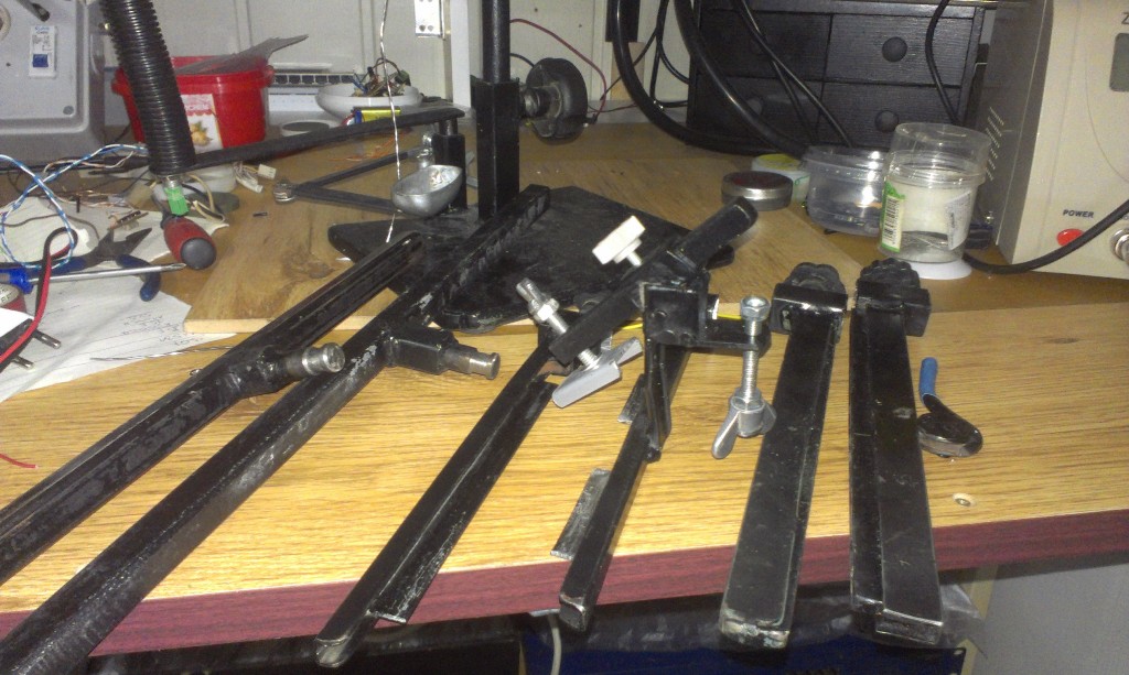 Alat je modularnog tipa, zauzima prostor onoliko kolika je i ploča za rad, sve ostalo je u vazduhu te je sto slobodan.Širina stola na kojem je 1m dubine 80cm, slažem se da slika ne može dočarati zbog mog fotografskog neumneća kao i mobilni.Sve se odvija na veoma malom prostoru 35x35cm.Nosač se rotira 360 stepeni, pomera se po vertikali i horizontali kao i visina.Ploča se lako postavlja u nosač, jedan ima deo sa oprugom za potpuno fiksiranje ploče za rad.Brzo i lako umetanje i izvlačenje.Nije uopšte komplikovan za izradu.Prva slika u prethodnom postu može dočarati veličinu, jer sto ima nastavak od 20cm (na njemuse na drugoj slici nalaze dodaci za alat).Evo slika rastavljenog alata.