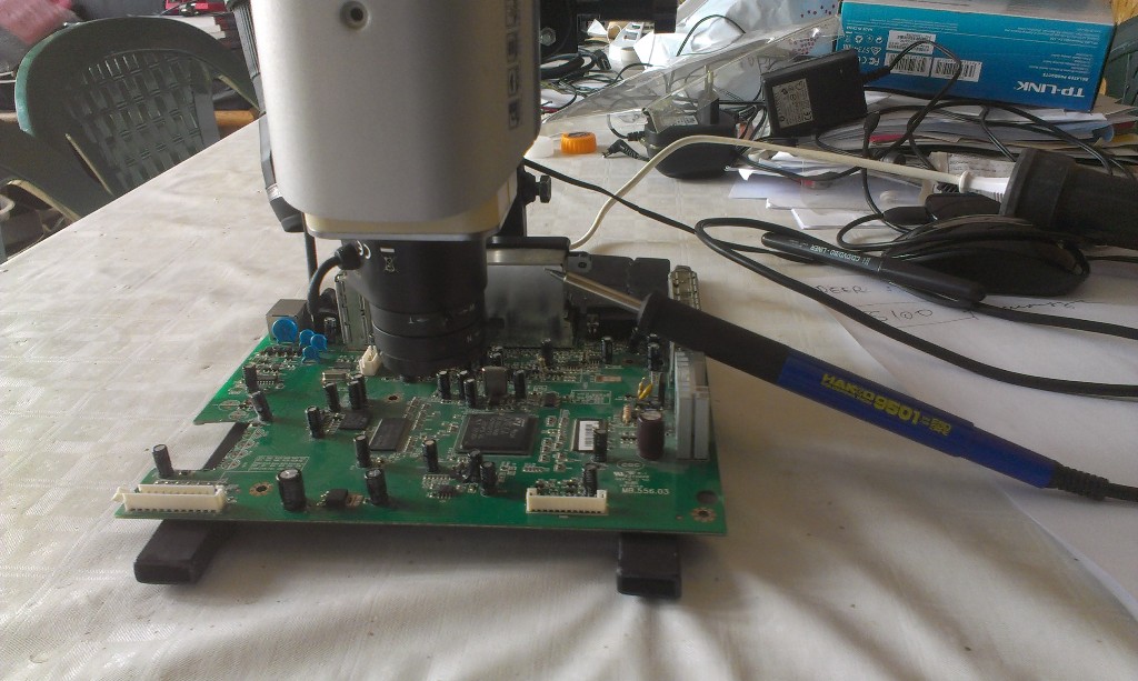 Ovo je sprava koja je potrebna kod rada sa sitnim komponentama i onom kome je čak i lupa postala problem (sve to ide sa godinama kao što je slučaj kod mene), a dobro dođe i mlađima da ne naprežu oči.Poenta svega je položaj monitora koji je mnogo bolji za posmatranje i rad na ploči (kao kad se radi sa lupom) od standardnih mikroskopa koji su do tri puta skuplji.Iskorišćena je starija kolor kamera za video nadzor, jedan osmoinčni TV monitor sa video ulazom, nosač kamere, malo lima i cevi i jedna led baterijska lampa.Ovo je već ranije odrađeno i samo je uvod za drugu spravu koja je u pripremi (menjam položaj sočiva na kameri ) pa će biti više slika u rasutom stanju za sklapanje.Sve ovo izađe ispod 100 evra (kamera 10-tak, monitor za video nadzor do 50)