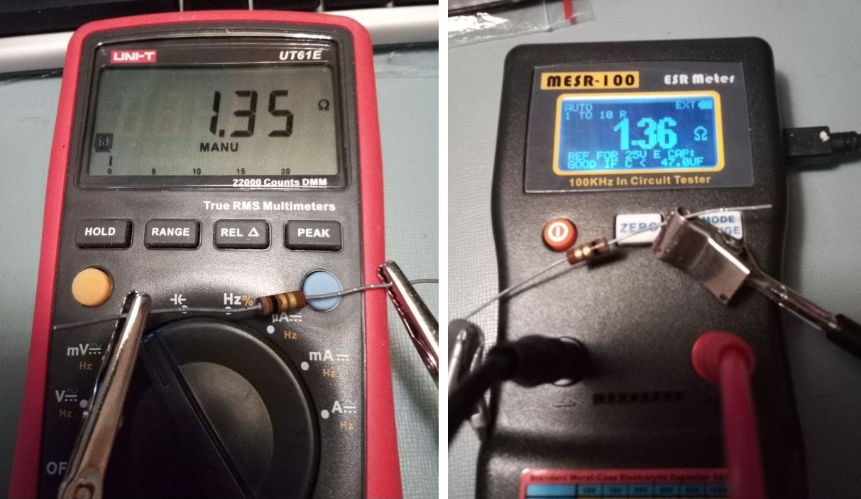 Prije bilo kakvog mjerenja i upoređivanja, izmjerio sam omsku otpornost mjernih kablova (pipalica) kod oba instrumenta. Takođe, mogu upoređivati čistu omsku otpornost kod oba instrumenta. Ono šta nijesam mogao da uporedim je izmjerena vrijednost ESR. Kako nemam profesionalni ESR metar, upoređivati MESR-100 sa „makedoncem“ bi bilo neozbiljno.