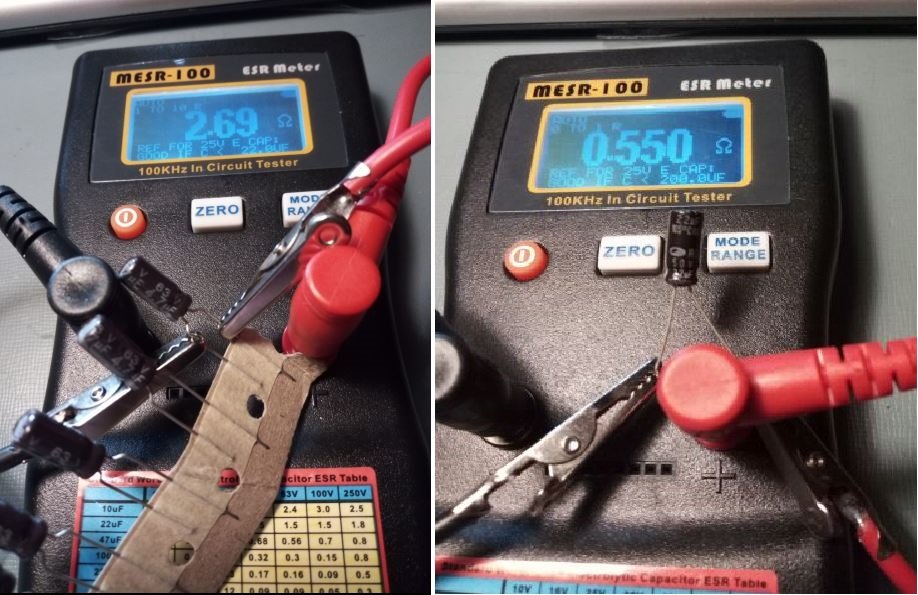 U svrhu mjerenja ESR-a na ploči (in circuit) treba koristiti kvalitetne pipalice sa silikonskim kablovima što debljeg profila žice i što manjeg otpora (do negdje 0.08 Ω max.) i tada sve funkcionira.