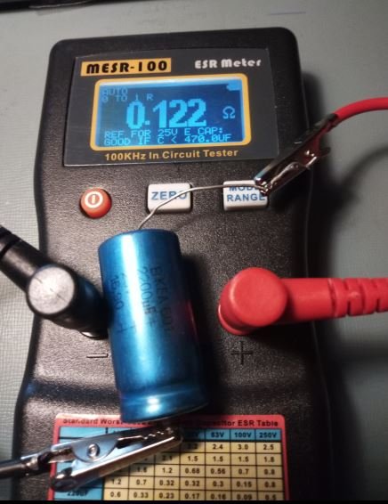 Kao što se vidi na slici u prilogu, ESR ovoga kondenzatora je 0.122 oma. Po instrumentu, ako je kapacitet manji od 470uF onda je dobar. Međutim, kako kapacitet ovoga kond. treba da je 2200uF, da se zaključiti da je kondenzator neispravan.