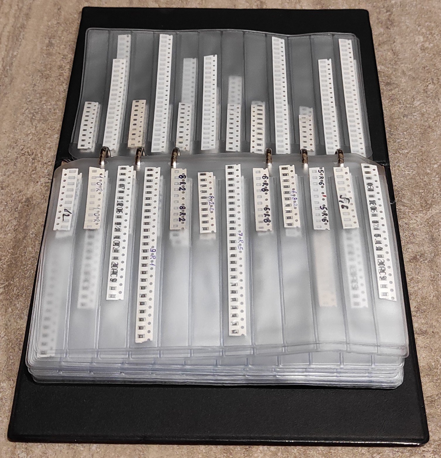 Ja za SMD komponente (otpornike , blok kondenzatore , zener diode ...) koristim ovu "knjigu". Kada se napuni mogu dodatno da se kupe listovi da bi se proširila.