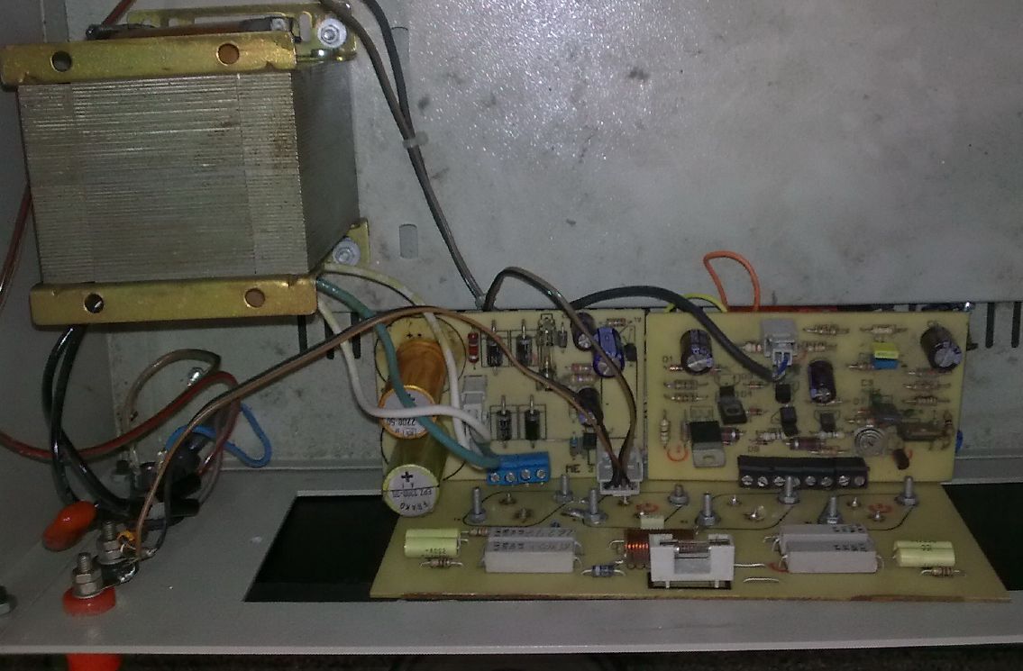 ,proveri izolaciju(liskune) kod tranzistora,a mozes i da otkacis 2 kom. 2N3055 ako ti je lakse oko provere,posto moze da radi i samo sa dva tranzistora.Obavezno zameni pobudne tranz. i proveri ispravljac da slucajno pod opterecenjem ne nestane neki od + i - napona...