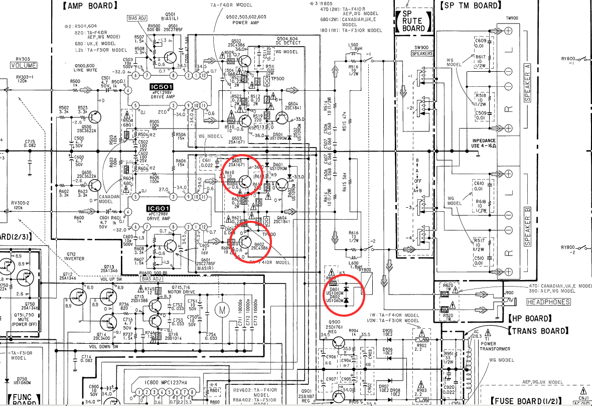 Dobio sam na poklon Sony F410R pojacalo koje nije islo kod majstora. Omskim ispitivanjem sam ustanovio da su na jednom kanalu izlazni tranzistori u kratkom spoju (Q602 i Q 603 na shemi) i jos sam za jednu diodu (D802 ili D801) ustanovio da je povecala svoju otpornost u provodnom smeru. Trafo je izgleda ok, omski nije u prekidu ni primar ni sekundar. Nisam bas neki strucnjak za opravke ali bih voleo da cujem Vase misljenje, da li se isplati popravljati ovo pojacalo i da li bih ja uz Vasu pomoc to uspeo da uradim. Skinuo sam izlazne tranzistore na ovom neispravnom kanalu i cekam savet neki savet da ne bih upropastio nesto. Pratim forum i vidim da na njemu ima zaista puno dobrih poznavalaca ove materije, a uz to i spremnih da pomognu. Nabavio sam i shemu. Islikao sam i unutrasnjost pojacala, pa ako treba da postavam slike i oznacim sta je u kvaru - tu su odmah. Eto, molim Vas da mi kazete sta mi je ciniti. Voleo bih da ga popravim i koristim. Evo da Vam jos opisem situaciju posle probe koju sam izvrsio. Prvo sam zamenio oba osiguraca i diodu i upalio pojacalo samo sa ispravnim tranzistorima da "vidim" sta se desava sa levim kanalom ciji su izlazni tranzistori ok. Prikljucih ulaz i zvucnik. Upalih pojacalo i na moju veliku srecu nije bilo belog dima. Sve kontrolne diodice svetle, i funkcijski tasteri reaguju na pravi nacin, ali zvuka na izlazu nema. Samo tisina i lepe zelene diodice. Ugasim i proverim, kad ono otisao novi osigurac F1. Pipnem izlaze oni hladni, a drajverski chip topao. E sada ne znam kuda dalje da idem. Razmisljam da ipak nije trafo u pitanju ili je mozda nesto drugo. Ako neko zna mozda bi mogao da mi pomogne. Njemu je to mozda rutinski, a ja nemam dovoljno slobodnog vremena, a ni znanja da bih ga opravio. Zahvaljujem svima koji bi mi pomogli da popravim ovo pojacalce.