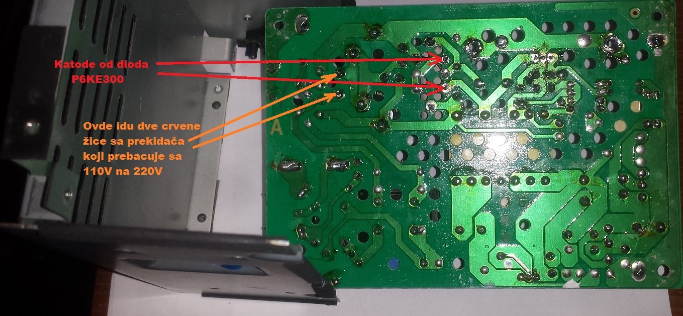 Iskreno nisam ni gledao. Samo sam pomerio da stoji na 220V. Svakako cu ga eliminisati da uredjaj radi samo na 220V cim stignu diode. Stigle su diode P6KE300A pa cu zameniti kao i integrisano kolo TOP227YN i mrezni osigurac i stavicu optokapler PC817 umesto originalnog optokaplera NEC2501. Kada prebacim prekidac na 220V te dve crvene zice nisu u kratkom spoju a kada prebacim na 110V dve crvene zice jesu u kratkom spoju. Malo se razlikuje primar od ovoga na semi. Ima li jos neko neki savet? Mreza je prosta ali zbog losih delova i spore nabavke me bas muci.