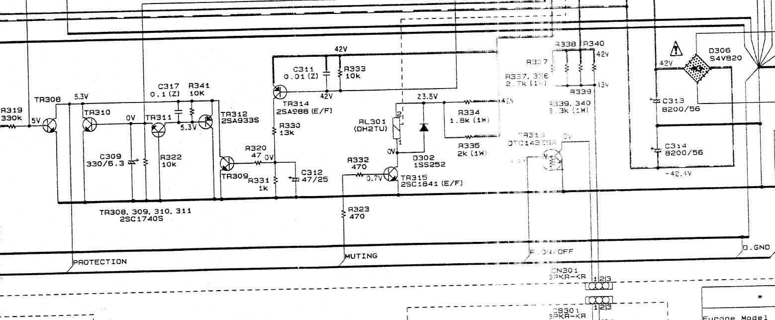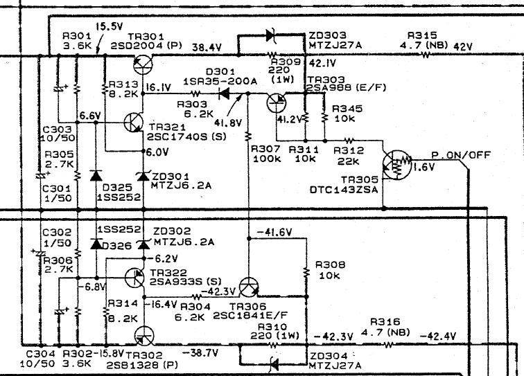 U pojacalu su neispravni TR306, TR322, ZD302 (vide se na slici). Vidim da ti elementi pripadaju negativnoj grani napajanja. Medjutim video sam da nemam izlazne napone ni +15.5V, kao ni -15.8V. Sporni tranzistor DTC143Z sam skinuo i izmerio, i dobio sledece vrednosti: Spoj baza-kolektor kao i baza-emiter 5.8k, kolektor-emiter 50 oma (?). To mi se nikako ne cine odgovarajucim vrednostima zar ne? Ako sam dobro shvatio, izmedju baze i emitera bih trebao da imam otpor 4.7k+47k, tj nekih 52k. Izmedju kolektora i emitera ne bi nikako smeo da ima 50 oma ako sam sve razumeo kako treba... Sutra bi trebali da mi stignu svi delovi, pa cu da vidim sta se desava.