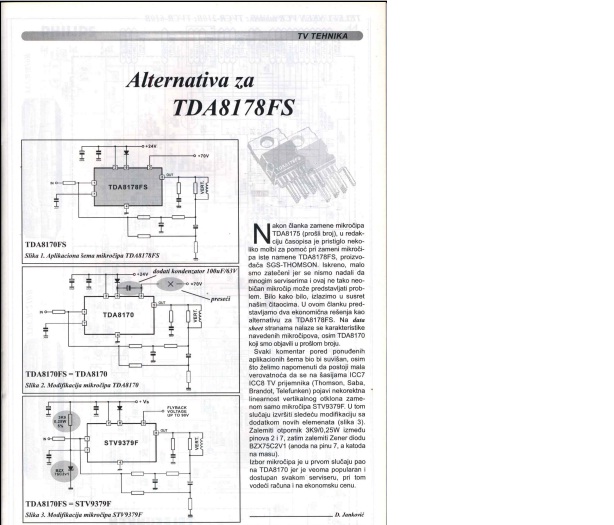 U ovom tv originalno IC u vertikali je TDA8178FS,ali se ono tesko moze naci na trzistu,pa se koristi zamena STV9379 uz male prepravke,potrebno je staviti zener diodu 2,1Vi otpornik 3K9,ali neznam na kojim pinovima kola.Ako neko zna nesto o tome neka se javi.Probao sam sa TDA8170,ali imam sliku u sirini od 5 cm po vertikali.