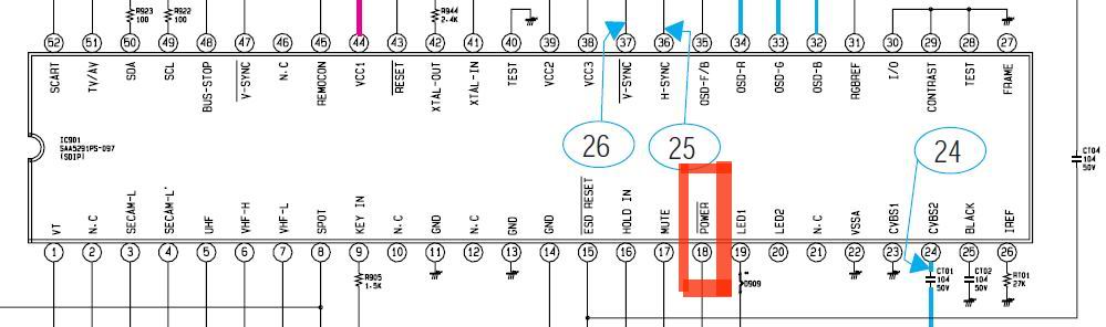 Pin4 od KA7630 se vodi kao POWER_ON ili CONTROL_BUS ili CON_POWER a kontrolise ga PIN18 od SAA5291PS-097 a kod tebe je verovatno isto.