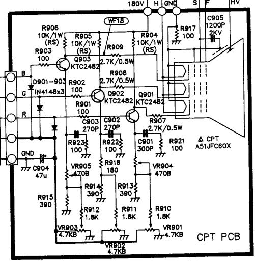 Resio sam problem uz vasu pomoc. Defekt je bio u pregorevanju otpornika R405 na ovoj ploci a njegova vrednos je 0,1 om. On je prenosio napon 180 v sa split trafoa na plocicu koja ide na katodnu cev. Zahvaljujem se nec-u i alexi_pg jer taj napon od 200v