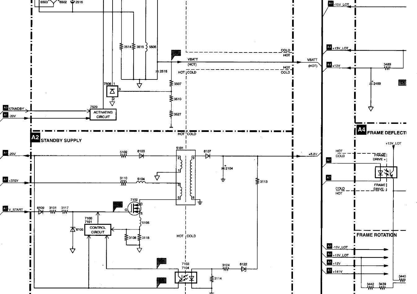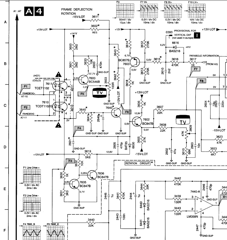 TV je svaki put pri ukljucenju krenuo da radi barem 5-10 sec, dok zastita nije proradila, a onda je otisao u standby. U tom kratkom periodu moglo se izmeriti odredjene napone i impulse i tako grubo locirati kvar. His je svaki put radio i naponi i posle hisa su bili korektni. Logicno je bilo proveriti vertikalu. Posto na izlazu vertikalnog stepena impulsa nije bilo, kvar je na neki nacin bio lociran. Jos kada sam grejanjem i ledolom "naterao" TV da proradi, makar i na kratko videlo se da neposredno pre prekida slika se skuplja po visini, pa i u liniju. Bilo je jasno da je greska u vertikali i trebalo je samo propratiti vertikalni i izlazni stepen. Merenjem impulsa F1 i F2 ispred optokaplera i impulsa F3, F4 i F5 videlo se da na kolektorskoj strani oni nedostaju. Zamenom optokaplera 7610, 7611 - TCDT1102G TV je odmah proradio i evo ga i danas besprekorno radi. Bez obzira sto je kratkospojnik ostao u vazduhu. Jos da napomenem da nisam imao original optokapler pa sam ugradio CNY17F-3 koji mi je bio pri ruci, a pokazao se mogucom zamenom. Imao sam potrebu da vam ovo ispricam u nadi da ce moje iskustvo nekome mozda biti od koristi.