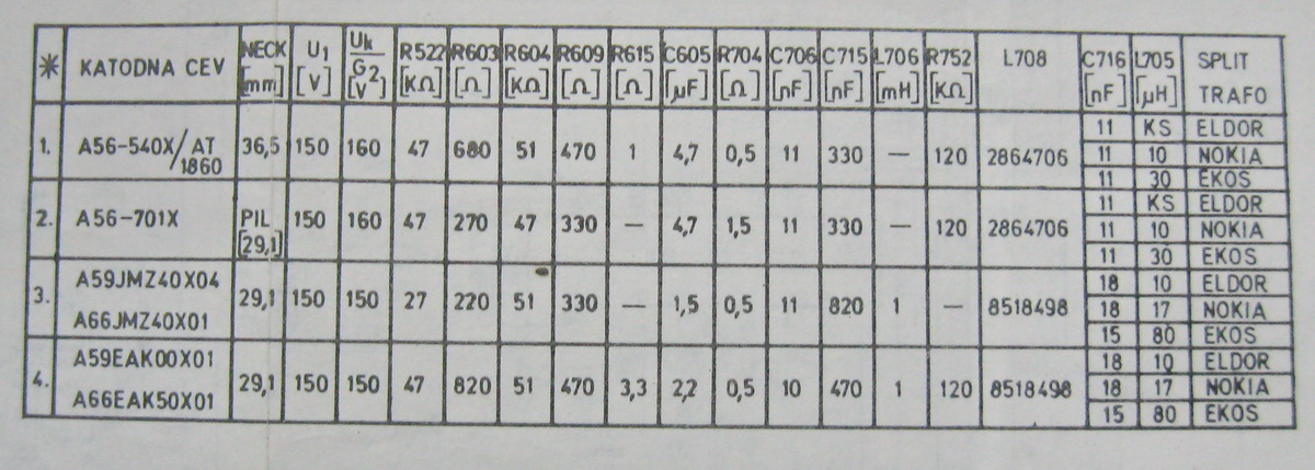 tabelu sa vrednostima pojedinih delova u zavisnosti od katodne cevi