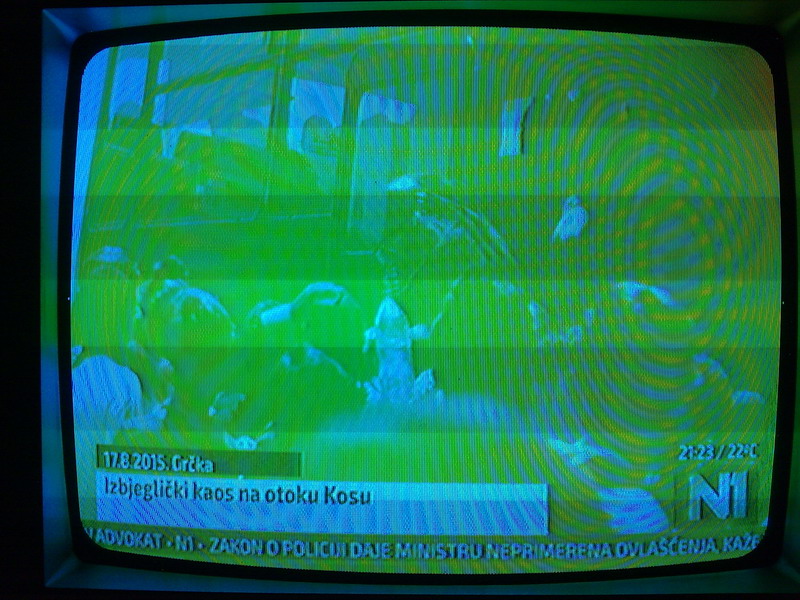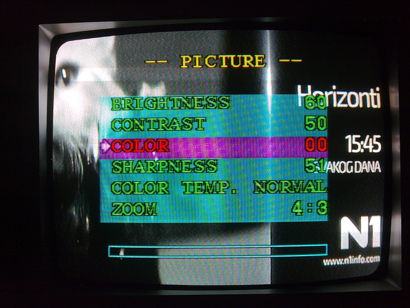 Zakačio sam slike, prva je slika bez menija, druga sa menijem, a treća je sa saturacijom na nuli. Ono što je zanimljivo, jeste da se pomeranjem saturacije prema nuli ne dešava da boja postepeno bledi(kao što je normalno) nego se dominantno zelena,pretvara u dominantno plavu i tek onda nestane boja. Isto se dešava i sa AV ulazima, ekran je zelen i ako sam spojio video ulaz na masu.