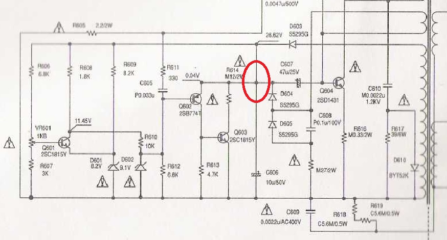 Da dodam napon na diodi D603 je oko 38V,R603,604 dobar,R618,619 isto,zener diode merene sa IU102 pored fluke-a,potenciometar dobar,i ne reaguje na promene.Skoro svaki element je meren pojedinacno,mada mozda sam od site neki blok kondenzator preskocio,prvenstveno mislim na C605....
