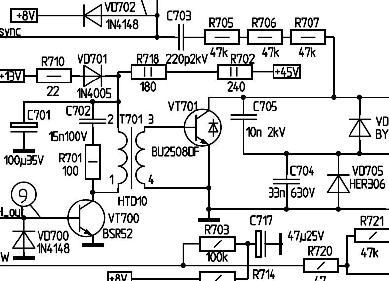 Dioda VD705 (ispred tranzistora) je bila odlemljena, zamenjen plavi vn kondenzator C830 (221 2KV), zamenjen blok kondenzator C704 (33nF 630V) pokazivao je da nema kapaciteta, prelemljen trafo u mrezi, fbt kao svi losi lemovi.