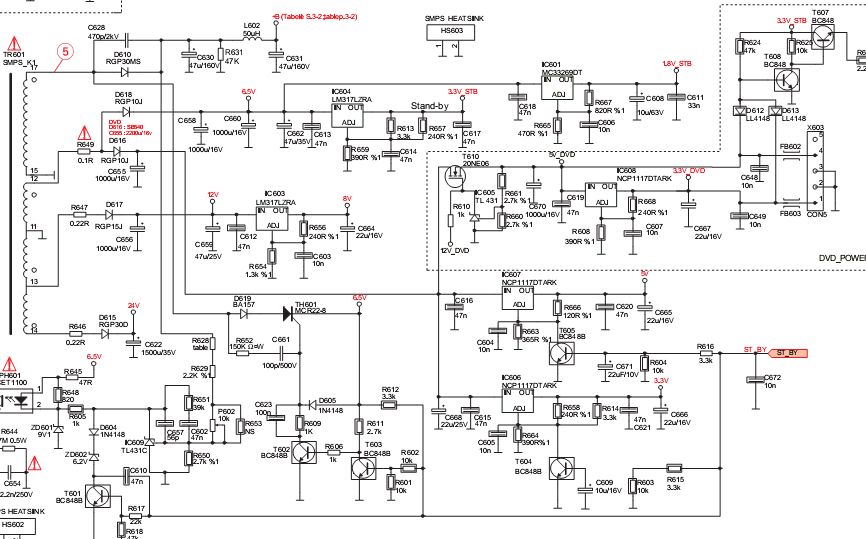 Svi naponi u sekundaru su mi malo manji nego na šemi osim B+ i 3.3v to je dobro. Ovo su naponi kad tv radi a kod mene ne reaguje ništa kad ga startam.D615 24v ja imam 22.7v. D617 12v ja imam 11.4v. D618 6.5v ja imam 5.4v