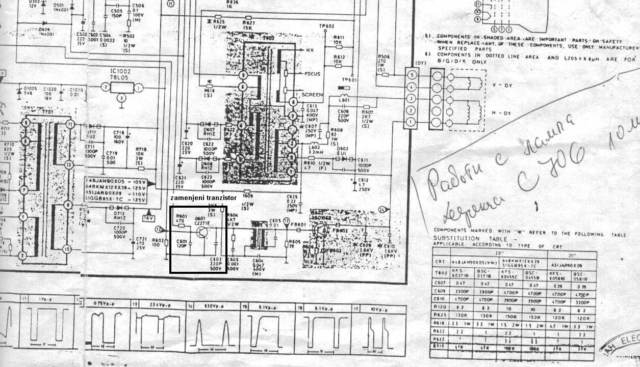 evo malo inofrmacija !! trenutno radim na drugi tv-a ,a sta se tice sijalicu treba da radi posto napon 130V ima ali probacu malo kasnije i dacu tu informaciju.Sta se tice Majstor Duja evo ovako prikacujem i semu i izgled sasije i originalan model TV i prikaz tranzistora koi sam menjao.tranzistor je preko transofrmer T601 dolazi na HIS tranzistoru.Obelezio sam na prikaceni fajl!!!