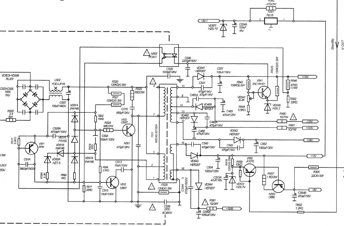 OPIS KVARA: U mreži zamenjeni sledeći delovi :tranzistori D5287C(stavljen BU2508AF),D1207,A1015 i C1815, diode 1n4148, BA 159,zener 7,5v i 6,8v (kod optokaplera), optokapler,kao i kondanzatori 150uf/400v,100uf/160v, 1000uf/35v kao i kondenzator 1n kod tranzistora D5287C. Kada se uklijuči uređaj , bez opterečenje(otkačen D1555),napon je 105v. prilikom kačenja sijalice, obara napon na 68 volti i pulsira, diže do 75 volti, pa opet obara.Dali je neko imao sličan slučaj, ili šemu za ovaj uređaj.