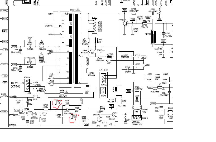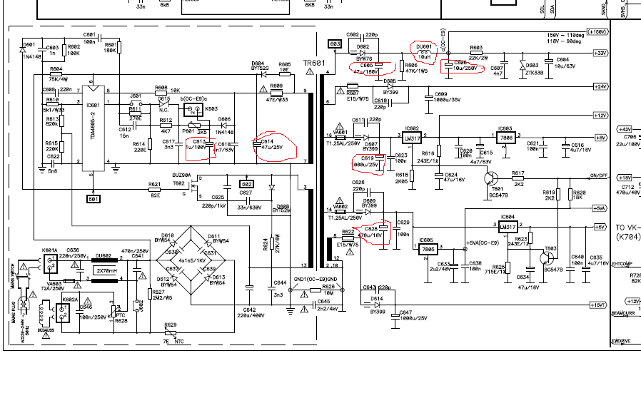 OPIS KVARA: u tv prvo pumpala mreza ,posle zamene elektorolita c606,c619,c626,c613,c614 , i pregorelih du601 ,r717,r724, tv se upalio sa veoma tamnom slikom ,osd je bio uredu to je trajalo par sekundi i ugasio se sada nema ni stand by samo na 12v snizen na 8v