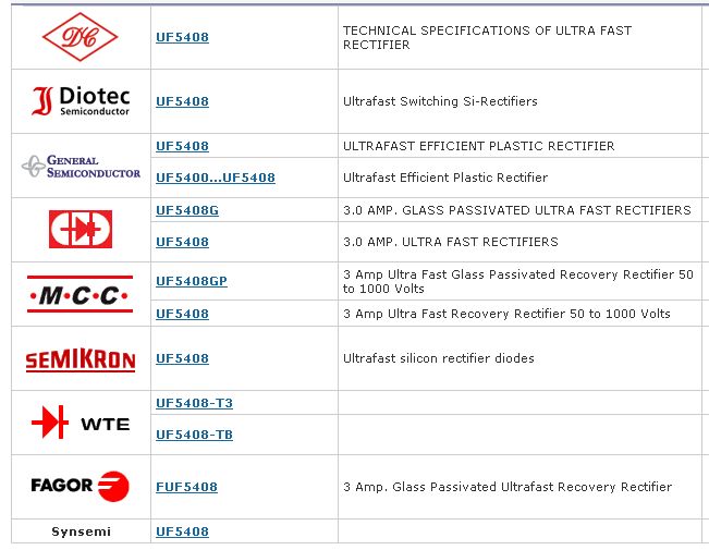 UF5408 je takođe ultrabrza.Verovatno u nekim zamenama pišu samo na osnovu struje i napona,bez vremena.Mnogo puta smo se uverili da zamene baš i ne odgovaraju kako piše.BY39x je 150ns do BY398,a BY399 je 250ns.To ne mora da bude isto kod različitih proizvođača.Evo nekih delova: