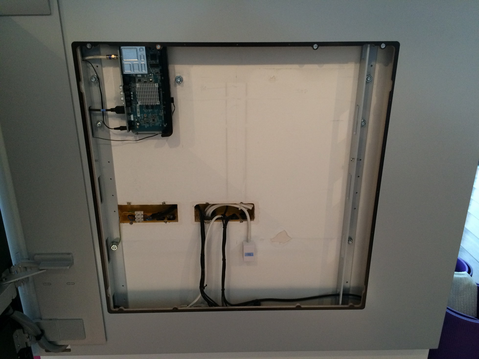 Uređaji poput SBB D3, produžni kablovi i ostalo su skriveni iza TV-a.