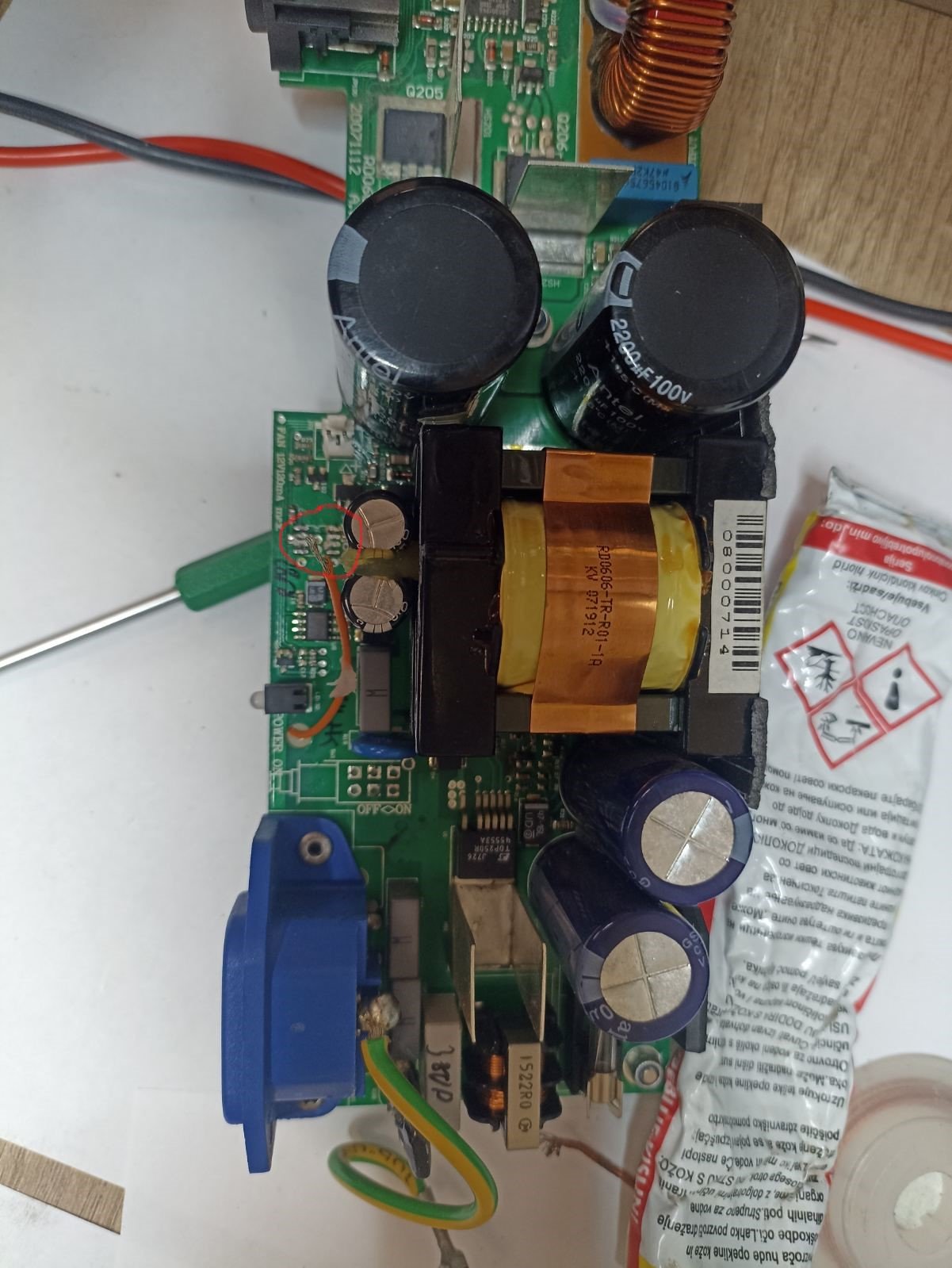 Taj deo koji nedostaje liči na SMD FET, verovatno pušta neki DC napon iz čopera kada uređaj nije u St.by. Pogledaj da li je taj mali sa 8 pinova sa slučajno f-jom.
