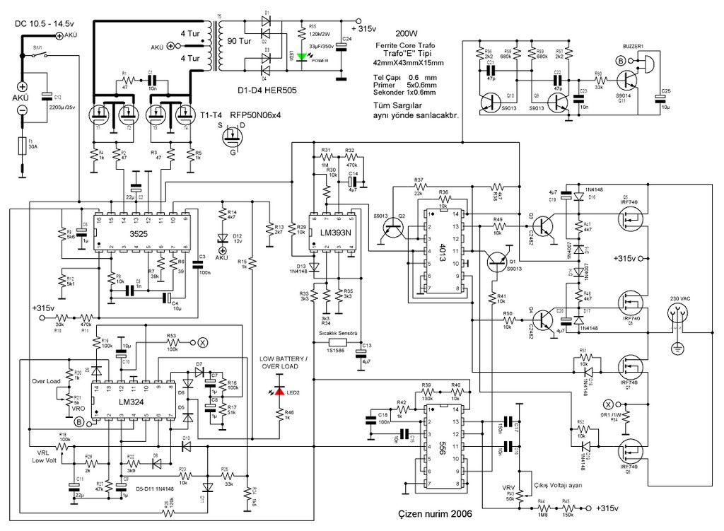 Kolege moje postene,evo se obracam sa problemom koji sam prihvatio da resim ,a nemam puno iskustva sa istim.Naime radi se o aparatu(inverter) oznake WHS-1000W,koji jednosmerni napon od 24V (iz kamiona)pretvara u naimenicni sinusoidni 220~230V,kojim kamiondzije napajaju svoje frizidere ,televizore i ostalu tehniku koju poseduju u vozilu.Ovaj inverter ima dva paralelna izlaza za naizmenicni napom,koliko sam ja mogao videti oba su izgorela.Naime radi se o tranzistorima oznake IRF 540N koji su bukvalno popucali i niz elemenata oko njih.Na slikama se vide i tranzistori male snage koji su izgarali i svi redom u kratkom spoju.Otprnici oko tranzistora IRF su ugljenisani pa ne znam njihove vrednosti.U aparatu su i tri integralna kola sa kojih je skinuta oznaka tako da ne znam njihovu namenu ,pretpostavljam da je jedno(najblize led diodama)upravo njihov drajver.Da li jeneko radio ovaj uredjaj ili poseduje bilo kakvu dokumentaciju molio bih ga za pomoc.Poslacu slke da vidite otprilike o cemu pricam>hvala i pozdrav