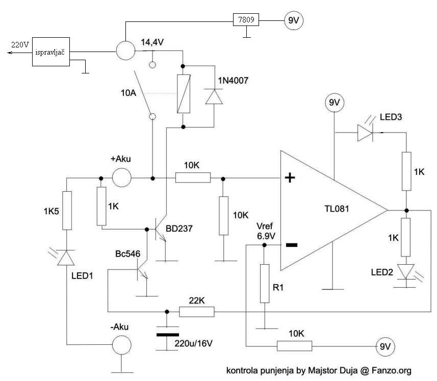 Ceo sklop je jedan komparator (tl081) koji, prilikom punjenja, prati napon na akumulatoru i kad isti premasi 13,8V setuje izlaz i odspoji rele. Bitno je napraviti 6.9V na (-)inv ulazu komparatora pomocu R1. LED3 sija kad se akumulator puni i kad je izlaz OP-a resetovan. LED2 sija kad je akumulator pun. LED1 sija kad pogresno spojis kleme na aku. Prilikom pogresno spojenih klema nemoguce je zapoceti proces punjenja jer je BD237 zakocen sve dok se na njegovoj bazi pojavi pozitivan napon. Postoji mogucnost ugradnje jedne zener diode ZPD10, redno, pre baze BD237 (anoda na bazi) i u tom slucaju ces spreciti punjenje akumulatora sa jednom ili vise neispravnih celija (potpuno prazan aku ima 10.8V na polovima, neispravan aku ima 9V ili manje. Ako stavis tu zenericu, docice do pada napona od 10V na istoj i ostace 0.8V za okidanje baze BD-a. Ako ti je to nepotrebno nemoj se petljati sa tim, napisao sam to samo kao ideju. Napon od 9V za napajanje OP-a mozes dobiti sa 78L09 (100mA, 9V). kondenzator na bazi bc-a sluzi da poveca histerezis punjaca tj. da smanji osetljivost komparatora.