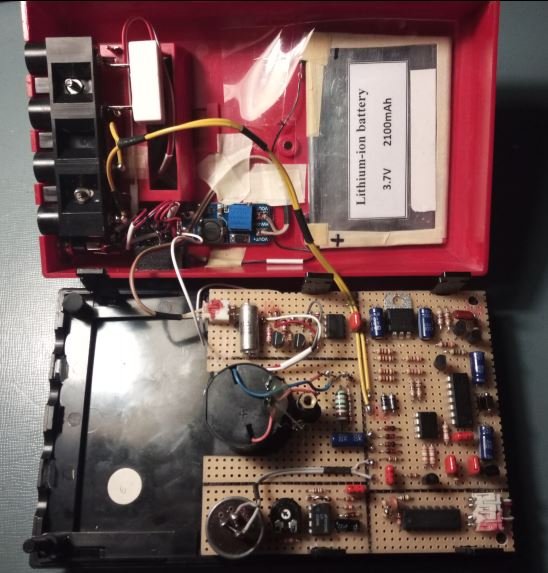 Nakon dosta eksperimentisanja odlučio sam se za LI-ion pljosnatu bateriju 3.7V. Kako je ovaj napon mali za pogon instrumenta, potrebno je ugraditi neki DC-DC step-up pretvarač (podizač napona) koji će od 3.7V da pravi 6V. Ugrađen je i modul BMS (Battery management system), kao i vizuelna kontrola (crvena/zelena LED) o stanju baterije. Bilo je prostora u kutiji i to sam sve ugradio da ne razmišljam je li bat. puna ili ne.