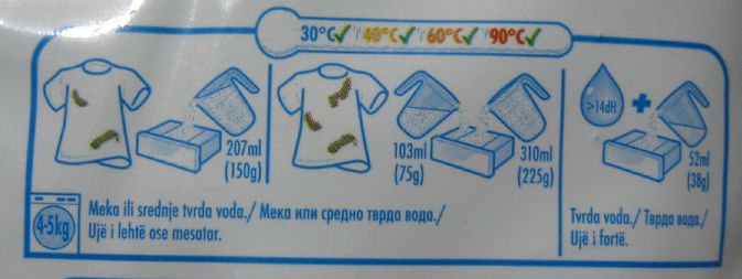 Inače, sad sam pogledao baš na pakovanju svog praška (da ne imenujem kog) i ladno preporučuju 60+160g za dobro zaprljan veš i srednju tvrdoću vode, ili 120g za malo zaprljan i istu tvrdoću... s tim da naša voda ovde u BG bi mogla da se računa i u tvrdu (postoji preporuka i za jako tvrdu u tabeli). Pa ti sad budi pametan, mi npr. stavljamo maltene pola od te preporuke ali objasni ti to ljudima.
