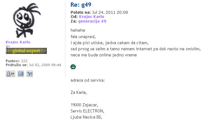 Predzadnji post sto si stavio sliku neke PP poruike sa Karlom. Prema tim podacima sam nasao broj telefona i ovaj link gore.