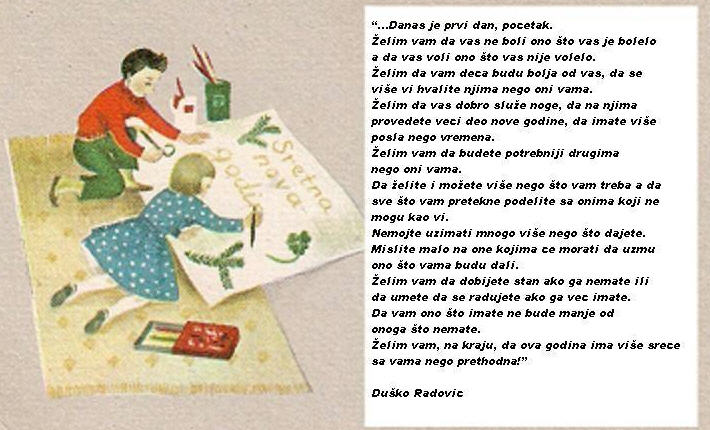I ide Nova Godina.Docice i 01 01 Nove Gospodnje....za pet dana.........Pas'te ovu lepu pricicu Duska Radovica.Meni to bas lepo, ukusi su razliciti .Licni stav.