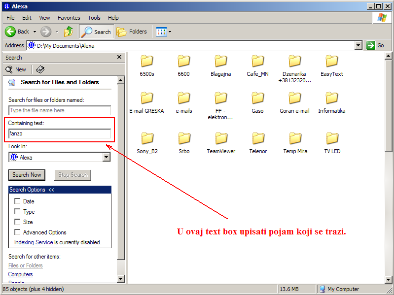 Decki nismo se razumjeli pa cu ovako ... Alexa imas taj folder Gaso unutar njega imas word fajl u kojem pise da si ti Gasi montirao antenu koja ima svoju MAC adresu. E sad kako ja mogu pretraziti po MAC adresi ja neznam da je ona u folderu gaso ja moram upisati u search "00:0C:42:66:05:BA" naravno bez navodnih znakova da on nadje od mase word fajlova bas Gasu jer je samo kod njega ta MAC adresa upisana. Nadam se da sam sad uspio malo bolje objasniti? Zato sam bas i naveo grunding kodove iz serijskog isti je princip