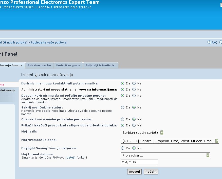 U zavisnosti od jezika koji ste namestili u svom profilu može biti i drugačije prikazano, ali je na istom mestu. Slika ispod. Sada stižete na sledeću stranicu. Na njoj kliknite na "Podešavanje foruma". Slika ispod: dobijate sledeću stranicu (slika ispod): Podesite Vremensku zonu na UTC +1, a "Daylight Saving Time je uključen:" NE (zimsko računanje vremena).