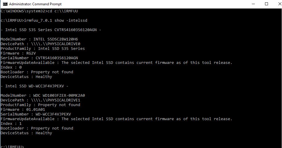 6. To verify the new firmware on your drive, run the tool executable with the following arguments: irmfuu_7.0.1.exe show -intelssd