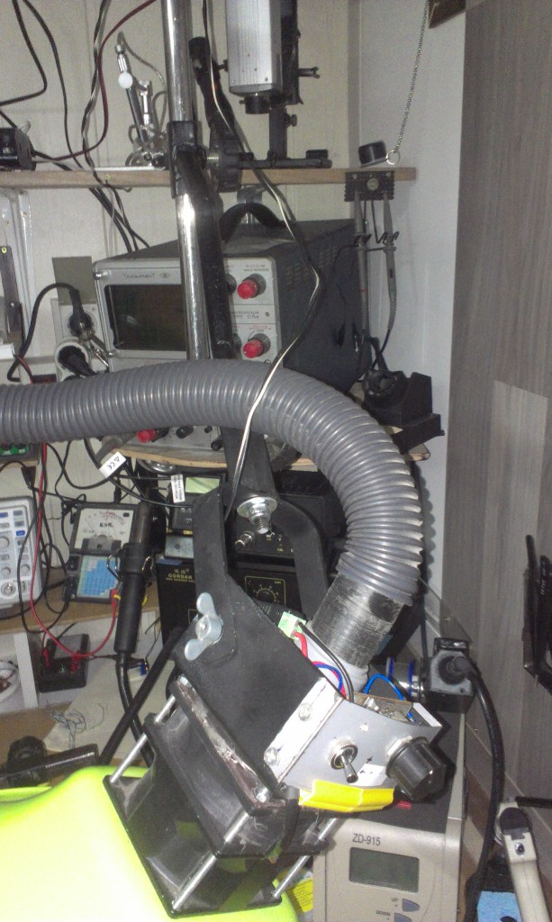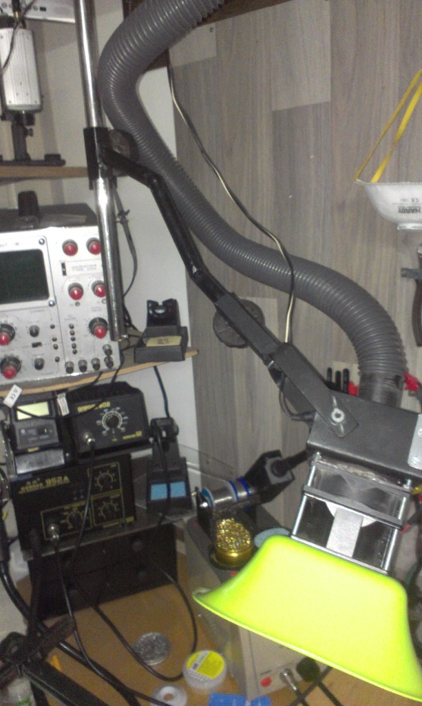 Ovo je nesto što svaki elektroničar treba da ima zbog šstetnih isparenja kod lemljenja i razlemljivanja.Korišćen je ventilator sa računarskog napajanja, jedna plastčna činija, malo lima, cevi od držaca tus baterije, malo crne cevi, i jos jedan ventilator gde je skinut propeler tako da je ostao ram koji služi kao odstojnik između ventilatora i činije.Pošto je ventilator malo jači stavljena je rgulacija (sa ne555 kolom) i to bi bilo ukratko.Crevo od usisivača sluzi da odvede gasove napolje.
