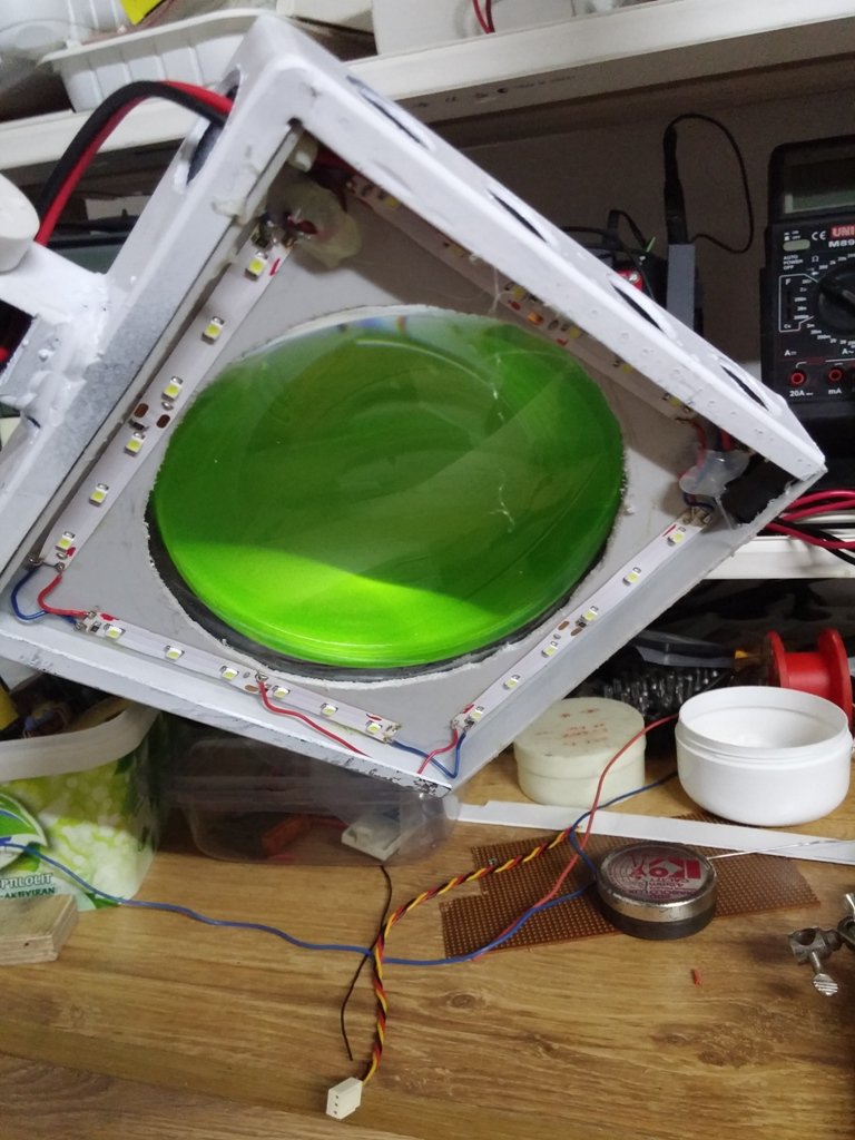 Ajd već, može nekom pomoći.Staklo je stavljeno u plastični slivnik (proširen je vidni otvor) koji je stavljen u metalni ram od cevi.Stativ je od cevi iz tri dela, može i flahajzn za te stvari.Treba malo bravarskog umeća.