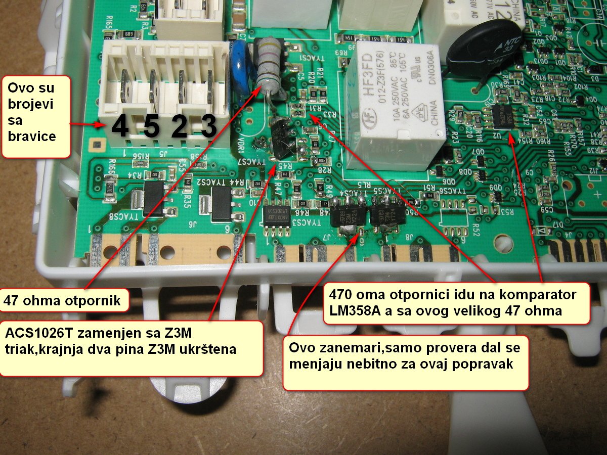 Da bi sve bilo začinjeno kako valja trebaju dva trijaka,jedan dakle vezan na kontakt br.2 i jedan vezan na kontakt br.3.I to nije sve!!!Ovaj triak koji ide na termičko/bimetalni deo na "zajedničkoj masi" ili COM izvodu ima na red vezan otpornik 47 ohma,te sa obe strane otpornika preko 470 ohma otpornika ide na komparator LM358,tj procesor tako dobija informaciju da tu nešto "radi" ,"ne radi",a ja sam u prvom talasu popravka izmenjao triake i grešku sveo sa E45 na E43,tj proradio je elektromagnetni deo a ne i termički,u stvari proradio je ali nije procesor dobijao info radi-ne radi,te u drugom talasu otpornik koji sam licnovao proglasivši ga nebitnim pronađem na internetu slike i zamenom komparatora konačno osposobio mašinu sve uz napomenu da se zameni i bravica.