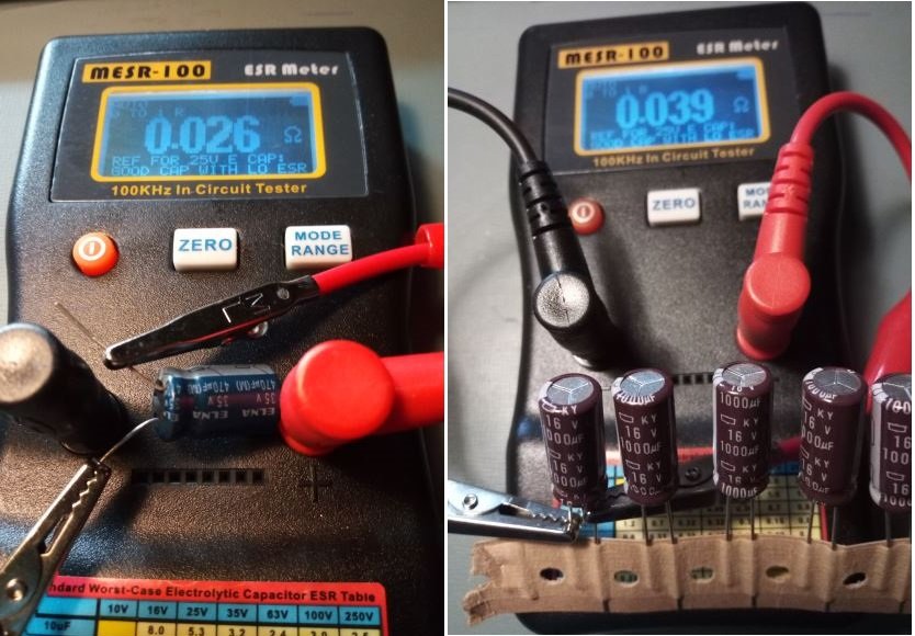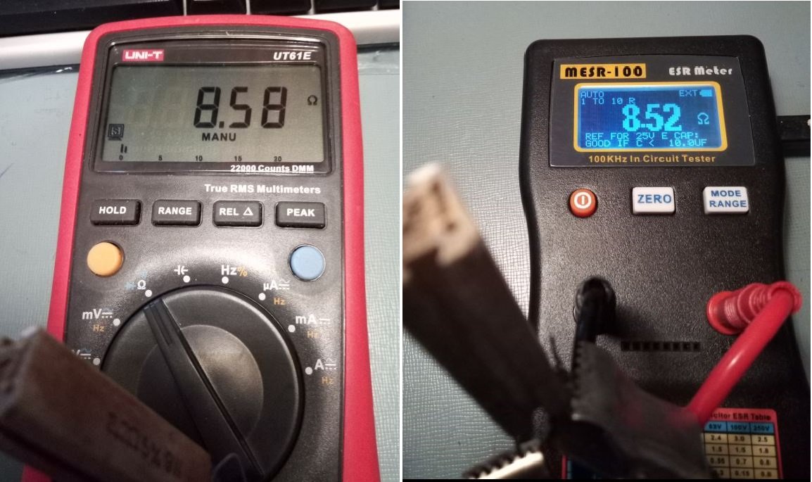 U svrhu mjerenja ESR-a na ploči (in circuit) treba koristiti kvalitetne pipalice sa silikonskim kablovima što debljeg profila žice i što manjeg otpora (do negdje 0.08 Ω max.) i tada sve funkcionira.