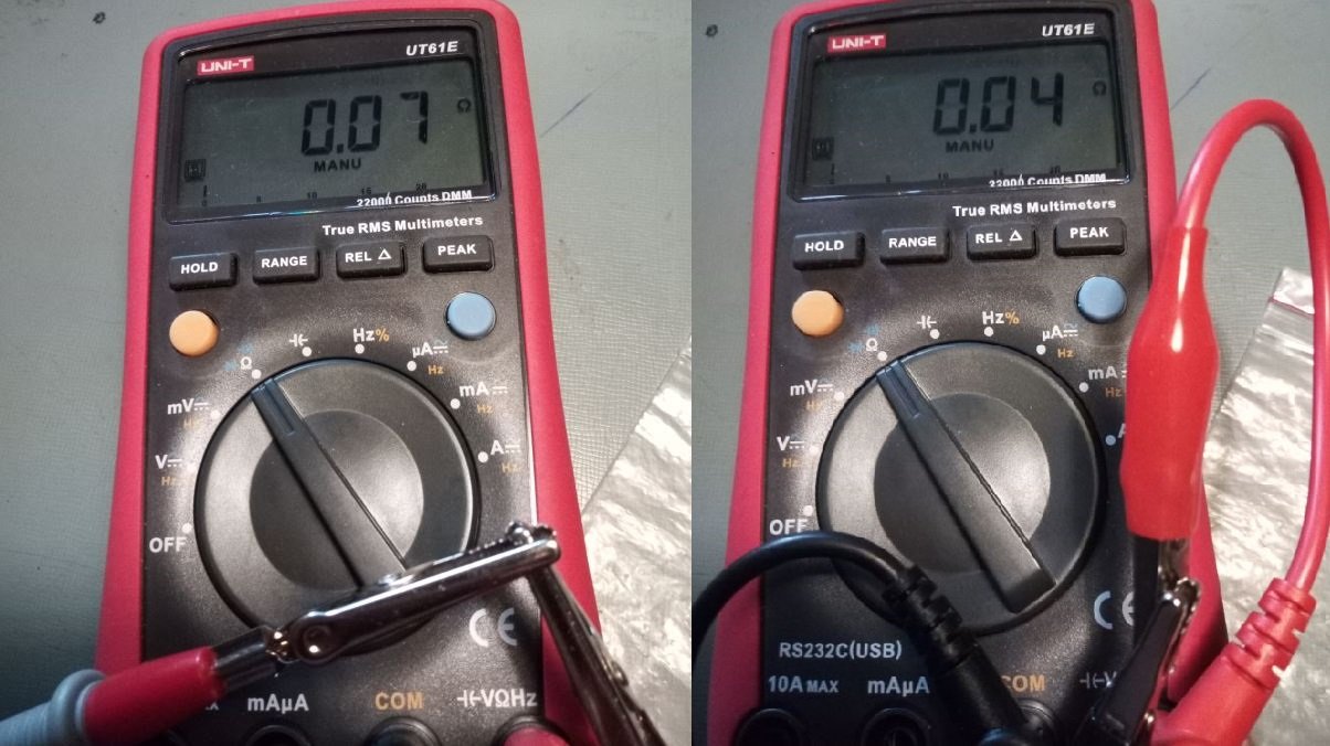 Instrumenat UT61E ima kablove dužine 125cm (2x125) i ukupna otpornost je 0.07 oma.